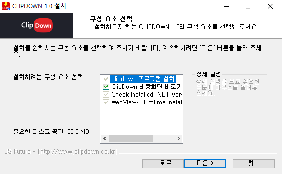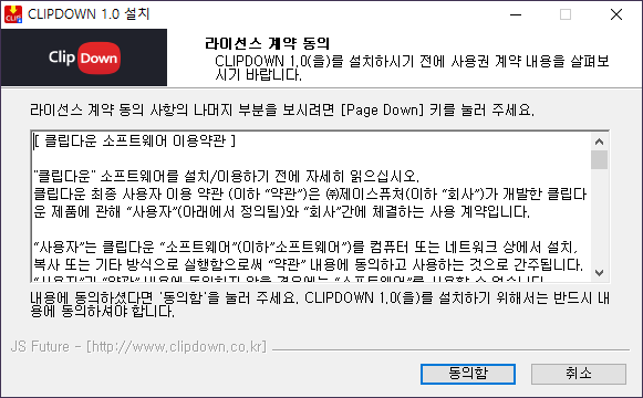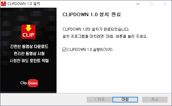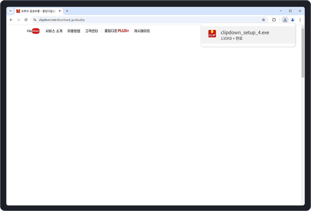 STEP2. 클립다운 설치를 시작합니다. 안내에 따라 설치를 완료해주세요. 01. 클립다운 설치를 위해 디바이스 변경을 허용해 주세요. 02. 라이선스 약관을 확인하신 후 [동의]를 클릭해주세요. 03. 설치 요소를 확인하신 후 [다음]을 클릭해주세요. * 클릭 해제가 안되는 항목의 경우 클립다운 이용을 위해 필요한 필수 프로그램입니다. 04. 설치 폴더를 확인하신 후 설치를 [클릭]해 주세요. 05. [마침]을 클릭하시면 클립다운 설치가 완료됩니다. 클립다운 설치가 완료되었습니다. 광고 없이 유튜브를 자유롭게 즐기고, 동영상과 음원을 마음껏 다운로드하세요!